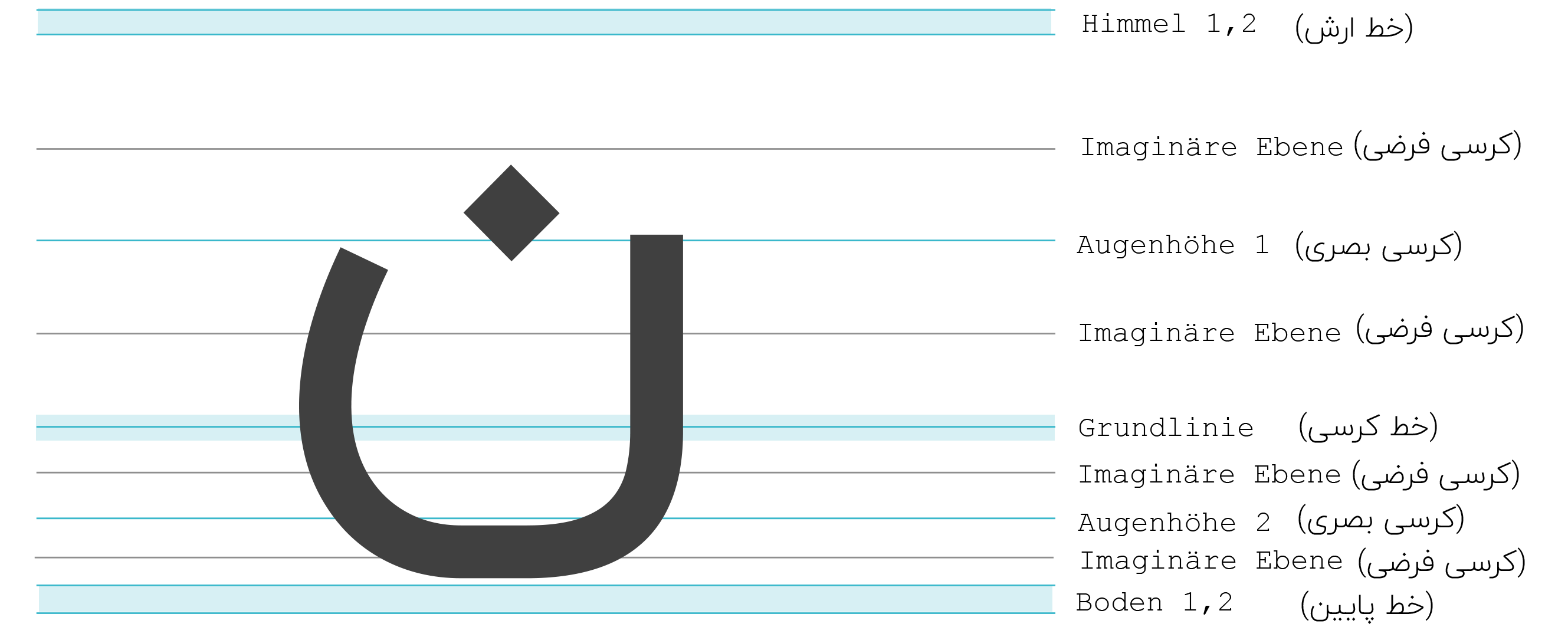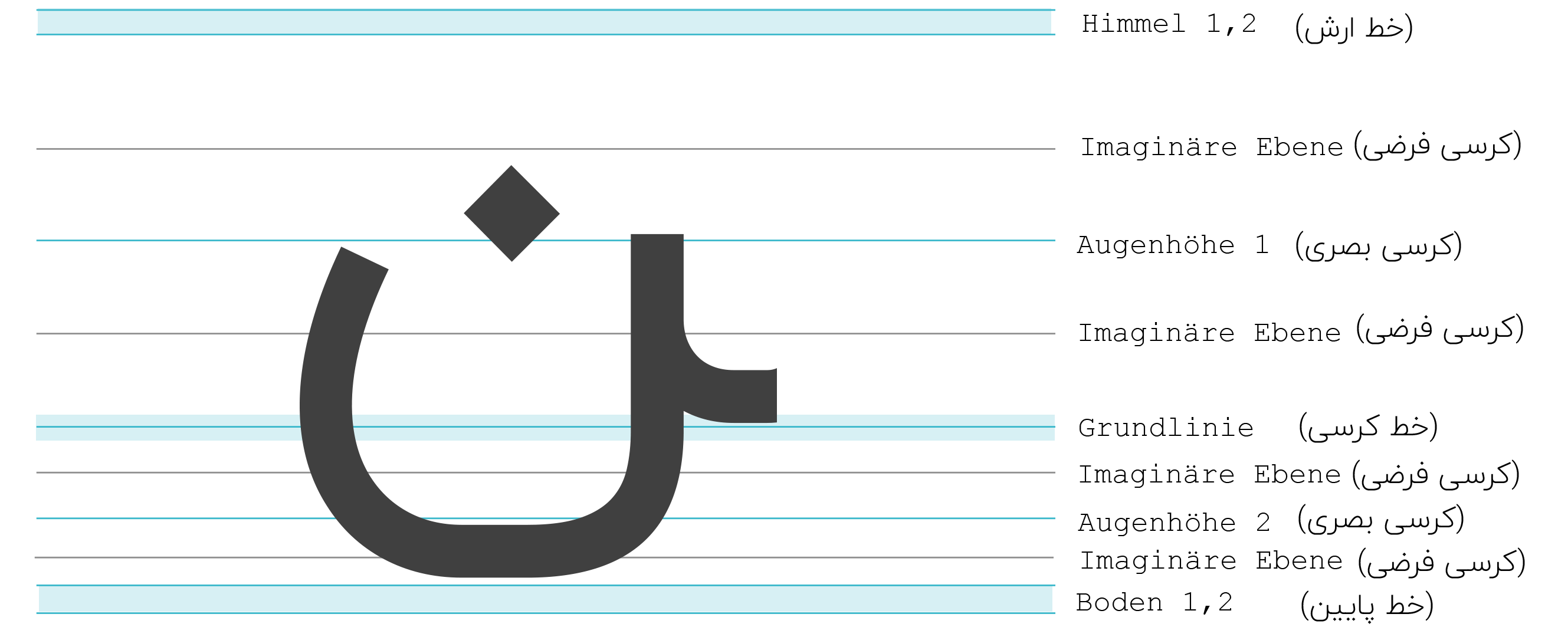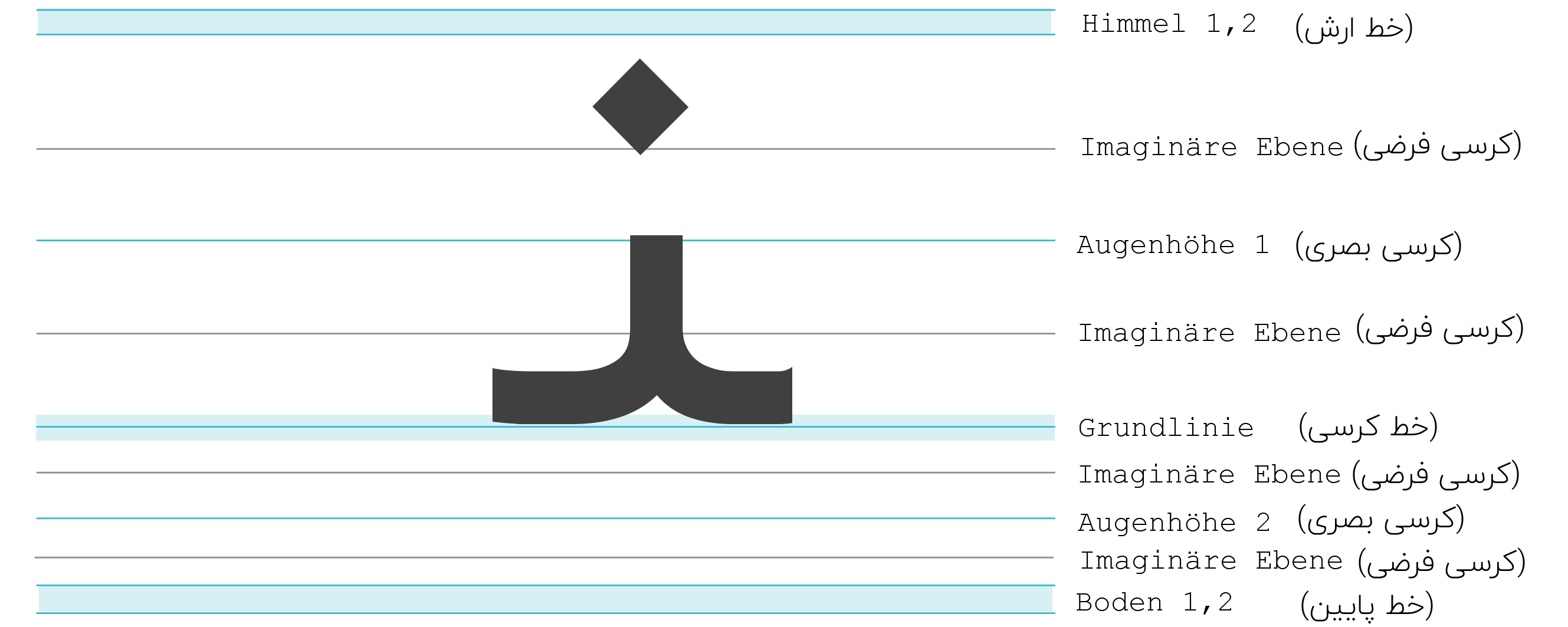 In der Formsache persischer Kalligrafieschriften spielen geometrische Prinzipien und Proportionen, wie Höhe, Breite und Linienführung des Buchstabens eine wesentliche Rolle. Die Höhe und Breite der Schriftzeichen und ihre Varianten stehen in bestimmten Verhältnissen zueinander.